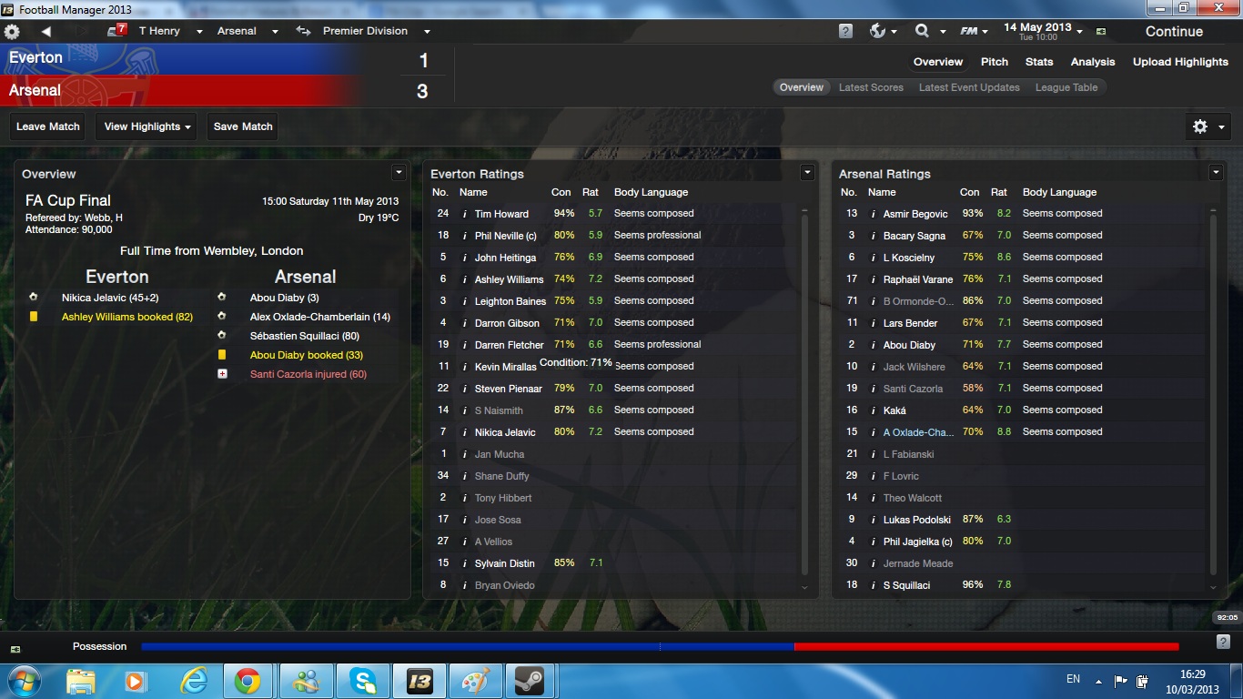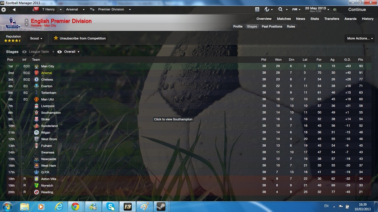 Manchester City went on to retain the Barclays Premier league with us 2 points behind them in second place. They did extremely well over the season and congratulations to them on winning the title once again.
