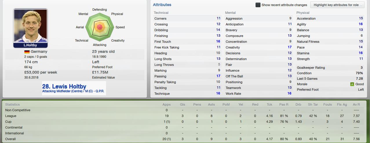 I then came across 3 more bargains firstly in the shape Of M Diame who would had some much mneeded bite to the midfield & if I knew of his 3.5m release clause I would of signed him earlier. A young brazilian CB Doria, who at 700k was a snip.... As well as Will Hughes who lit the Championship up in the first few months of the season and 1.5m for a player of his quality & potential was great business.