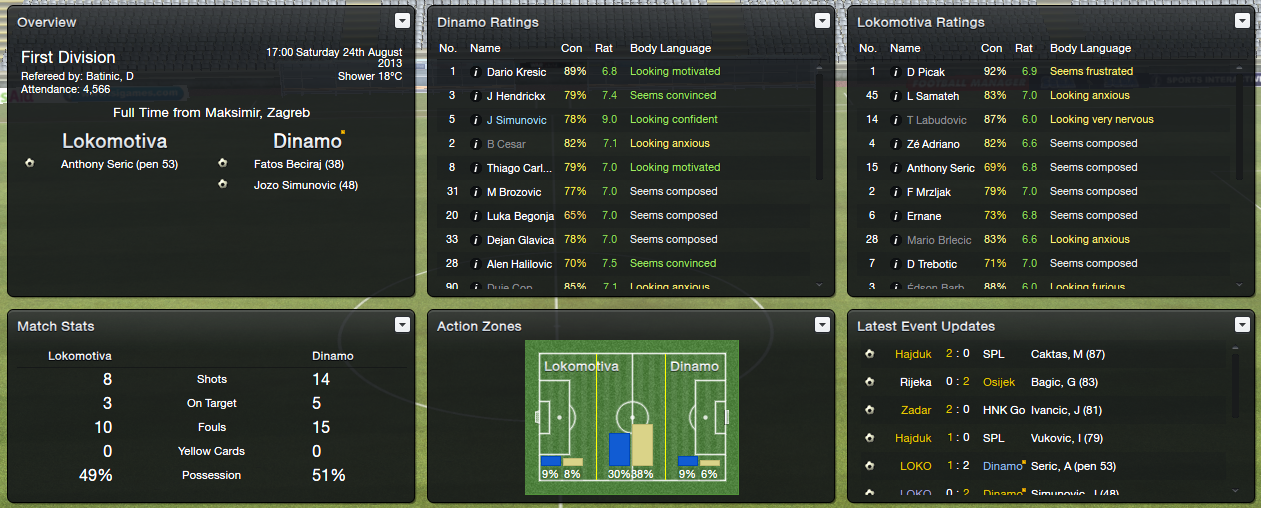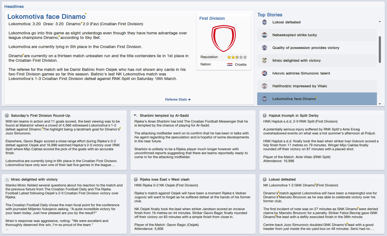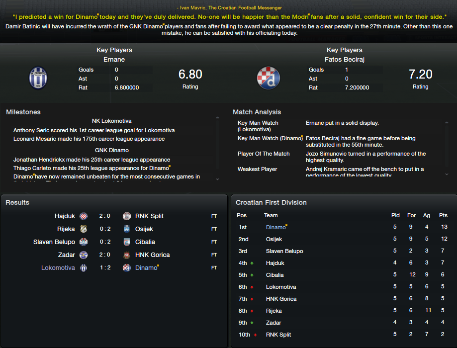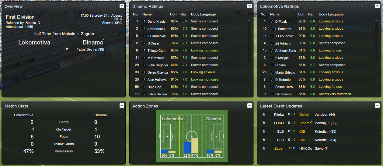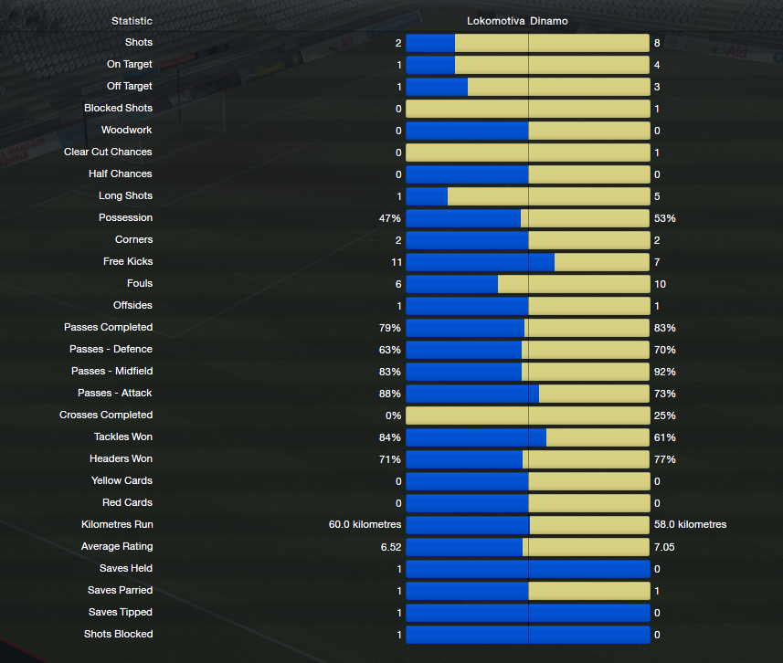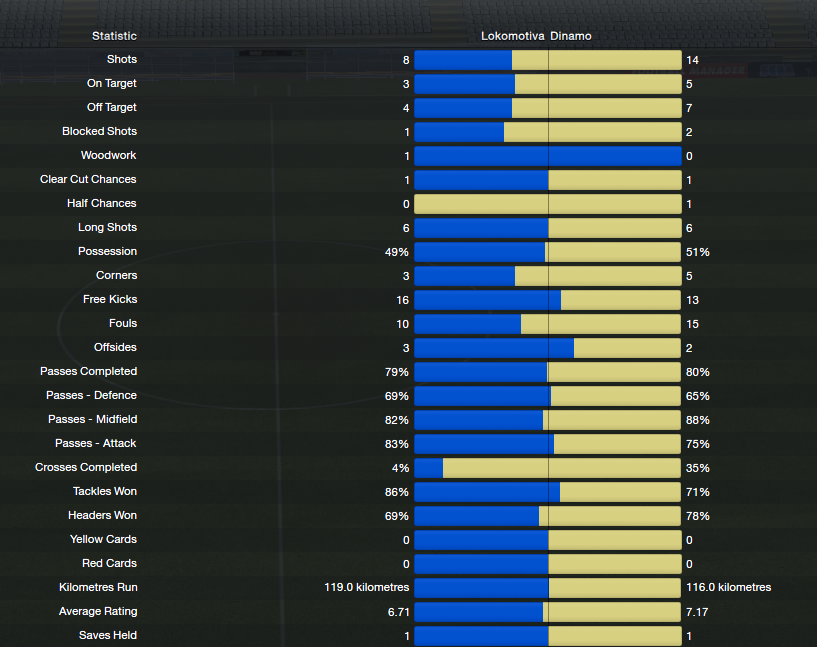 Then moving more forward, we playing against one of the great team and we get two goals with players which are not under 25... So i do not understeand why they shit on every aspect of Dinamo and callit their's and its not of course... oh btw.. tickets was free... so its not strange than whole stadium was full... but when you need to pay emptpy stadium. We are doing hard as we can, going from one trouble to next and fans are destroying blessed club by blessed peoples and with words it just came to question are they want keep Dinamo motivated when playing against such a hard team or will mix in the shit which they do not udersteand. Football is big mess when you get into details and than me, who was picked from street need lisen that. First i am on drugs and i sayed that one hundred times probalby and then i must watch my players lisening shit on peoples who gived them oportunity and other to be in glory club which will be. Main problem is that that other teans where doing all to crash and steal Dinamo, even with ice cream (this is not joke). So i think that West need to be more tough on them because they do not understeand its demotivation for players. So i giving moral, they broking it on match and on the end you get nothing and players doing all they can, and showing great potential how much far we can go.