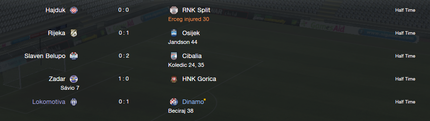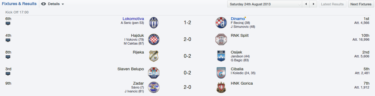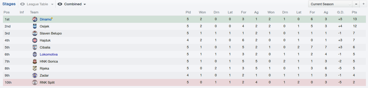 Nakon trećeg kola imamo dinamo na prvom mjestu sa sedam bodova ispod njega je slaven belupo sa 7 ali i slabijom govora zvonko osijek ima šest bodova na trećem mjestu rijeka i hnk gorica opet podova hajduk je na šestom mjestu 24 boda koliko je lokomotiva split izadar imaju po 1 moto cibalija na zadnjem mjestu 70 bodova iz tri godine utakmica.