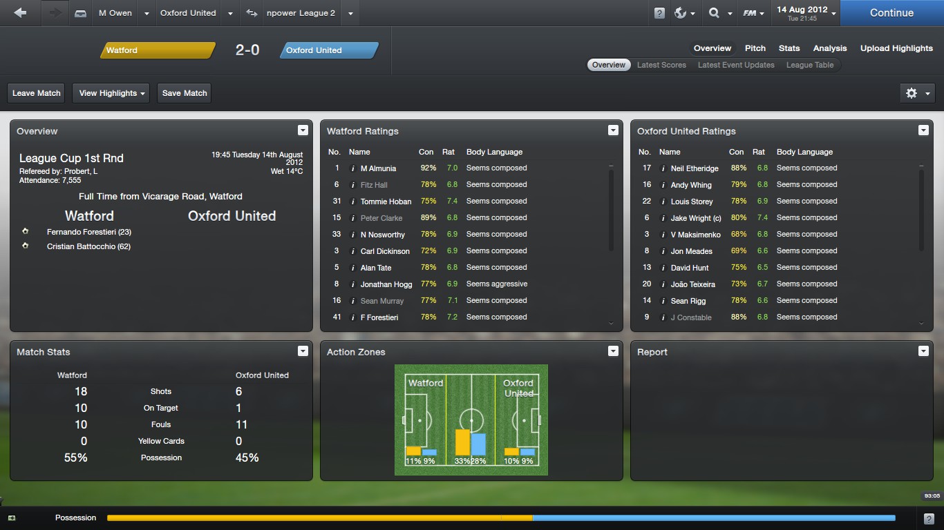 The Capital One Cup kicked off today, with all eyes looking towards the game at Vicarage Road, where Watford hosted Oxford United, the team who, last month appointed English legend Michael Owen as manager. The game went largely as expected with Watford dominating possession and scoring a goal either side of the half time break. Fernando Forrestieri scored in the first half, while Cristian Battochio scored the other goal. However Owen's team played well and had a few chances of their own. A host of new signings made their competitive debuts for the club including 33 year old Dave Kitson, previously of Stoke and Reading. For full statistics, see below.