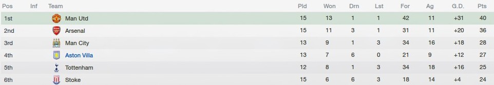 The league table shows an unbeaten Villa in fourth place after 13 games but they have slipped off the pace with their recent inability to claim victories.